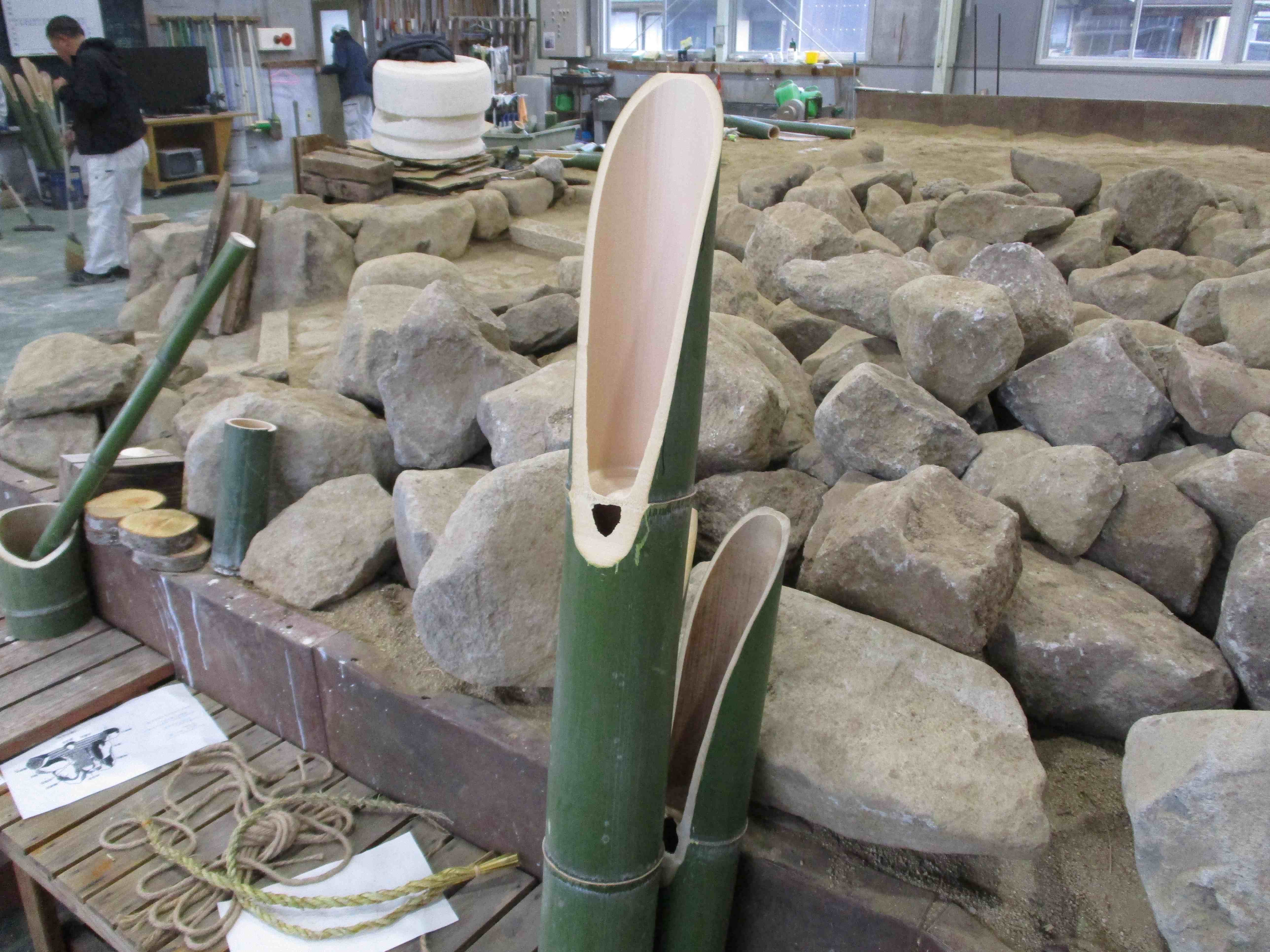 実習場内で練習した後、校内の古くなった金閣寺垣を建替えます。