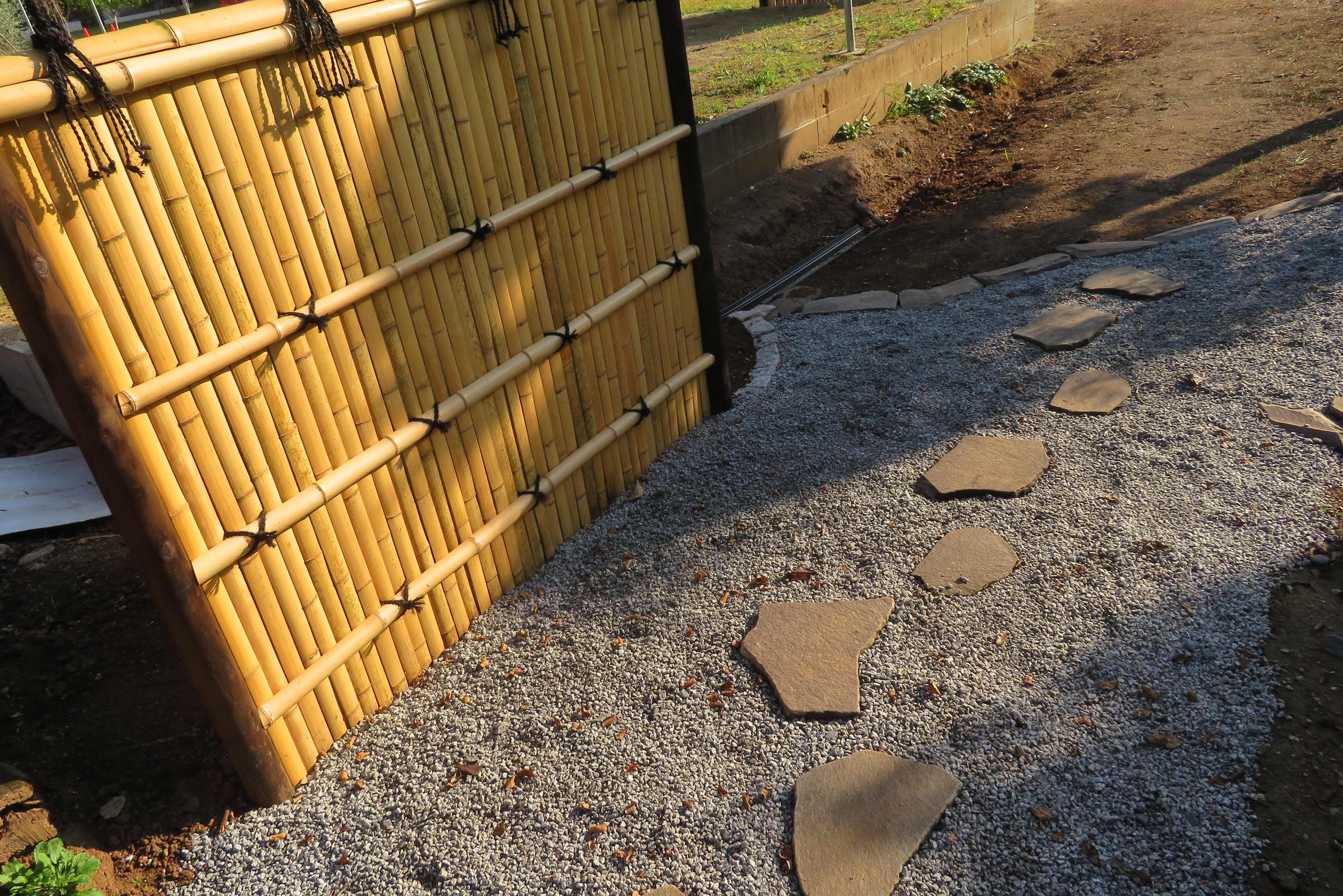 石材や植栽の後ろにある建仁寺垣が和風庭園を感じさせます。