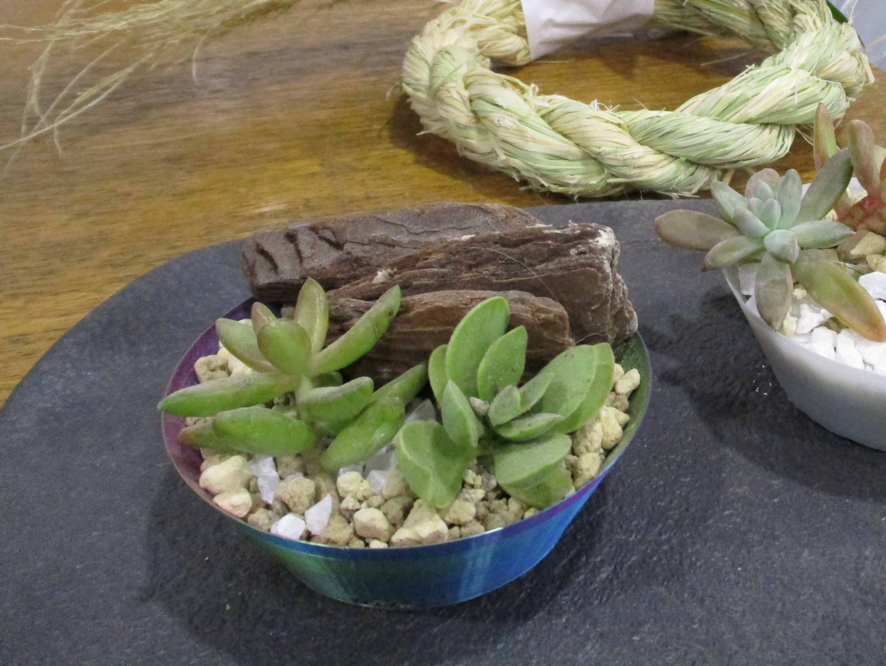 ガーデンエクステリア科で庭づくりの材料を使用しミニ盆栽を、オフィスビジネス科では3DCADソフトを用いて、コースターを製作しました。
