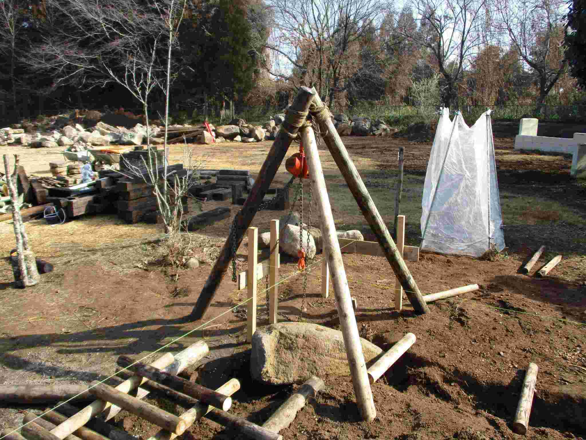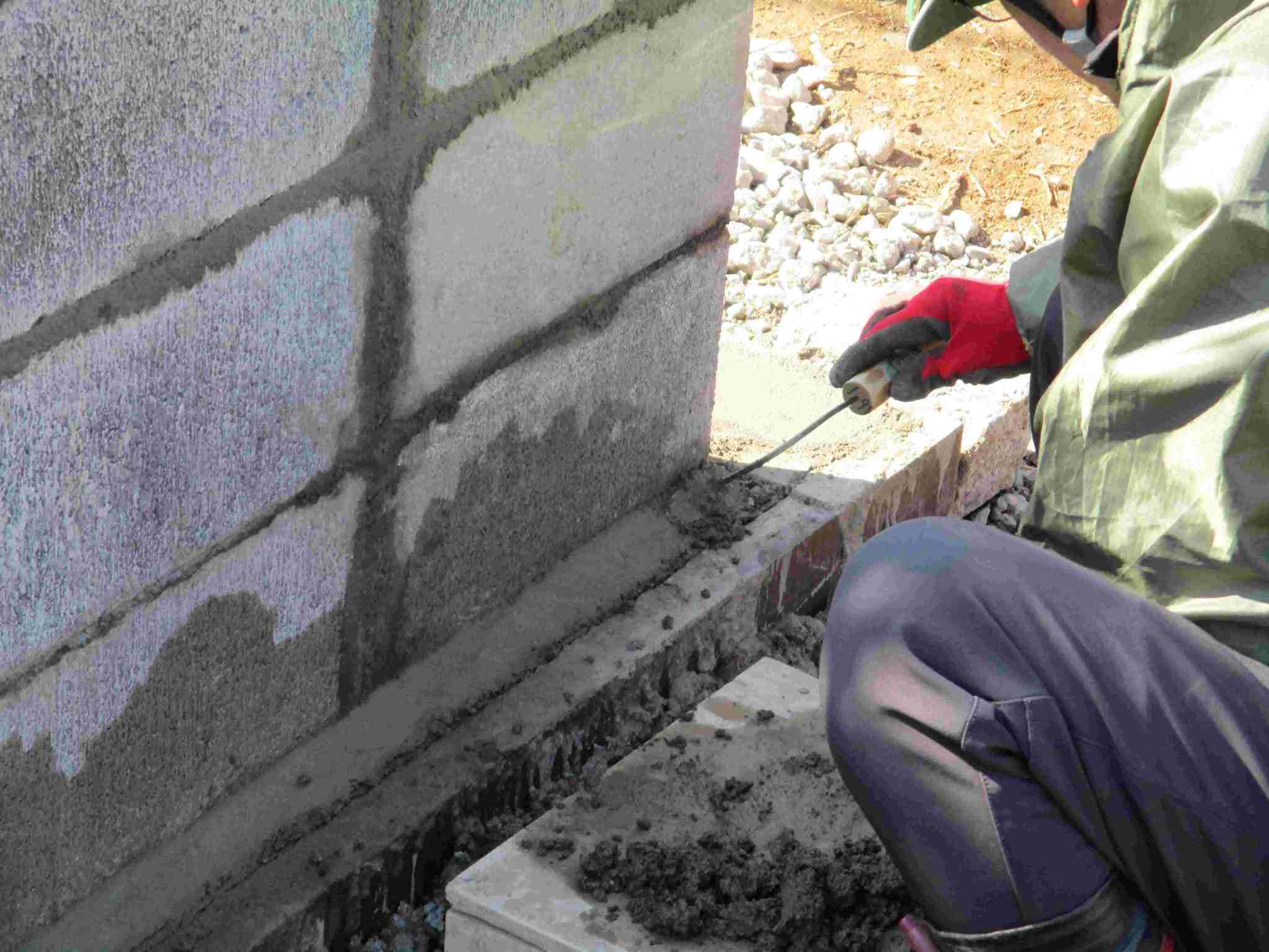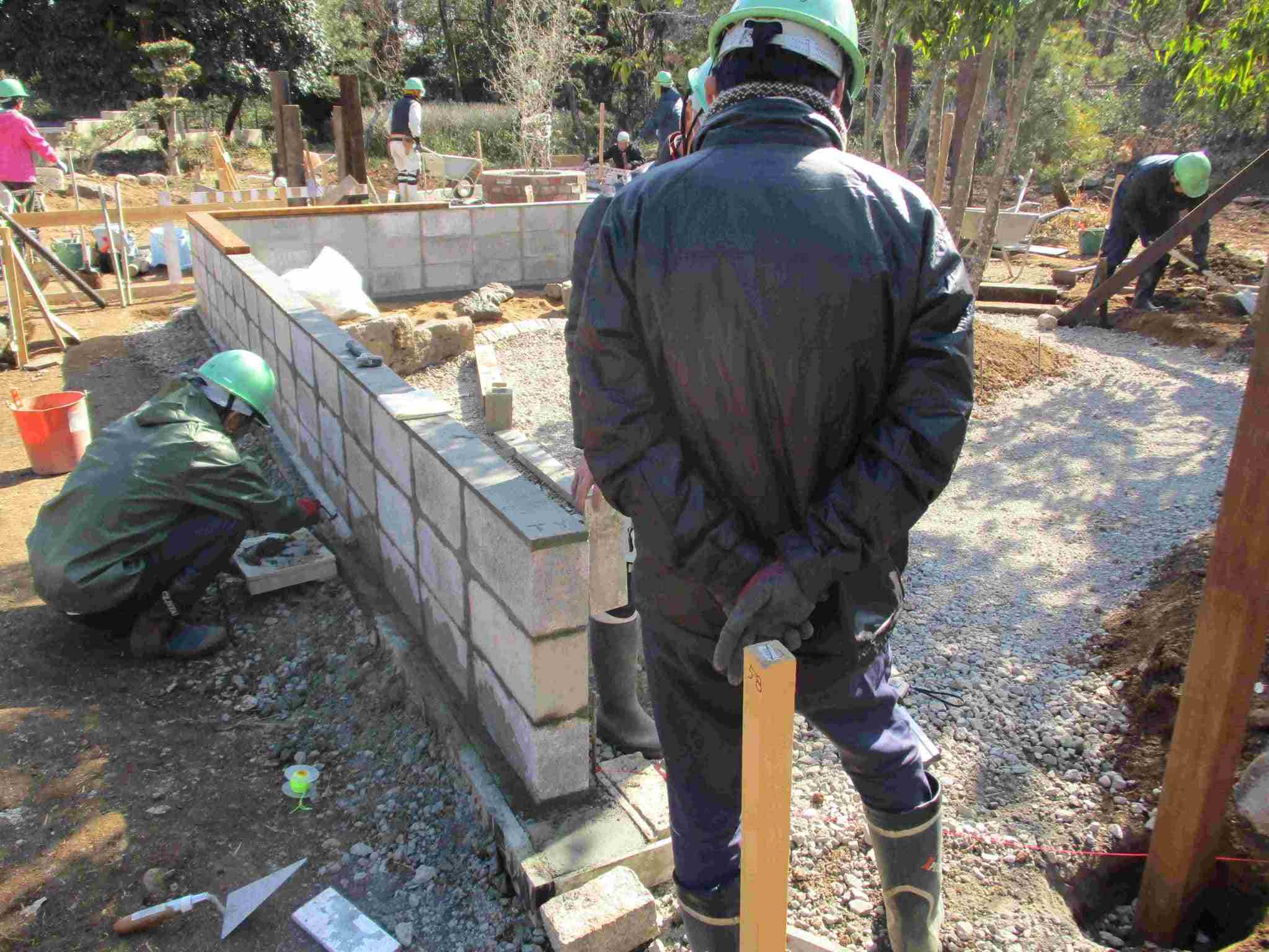 班ごとに分かれ、石灰モルタルを使っての作業になります。鉄筋の加工、鏝の使い方などを学び、ブロックを積み上げていきます。